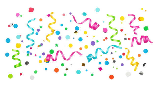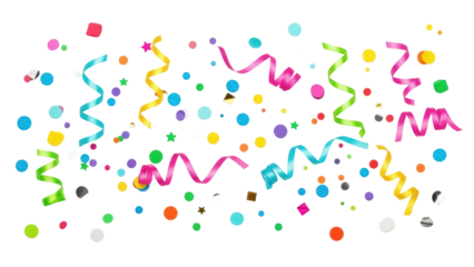 Festive confetti and ribbon PNG isolated on transparent background, colorful party decoration elements for birthday and celebration designs