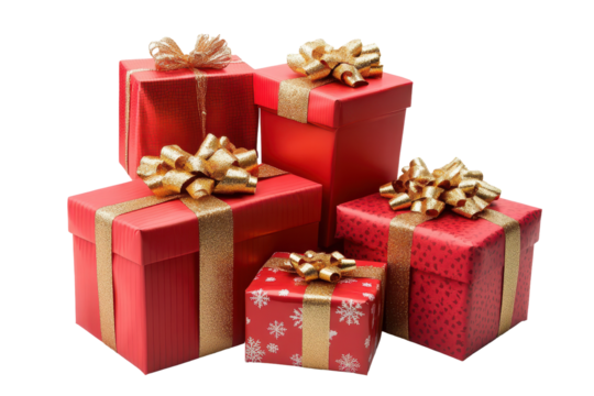 Vibrant stack of red Christmas gift boxes adorned with golden ribbons and bows, perfect representation of holiday cheer and festive surprises in a joyful setting