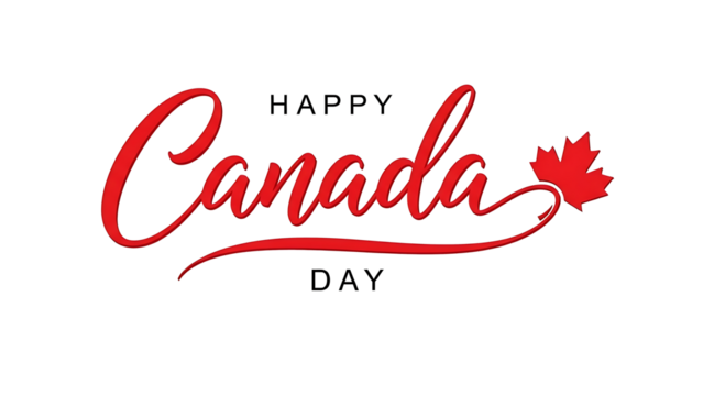 Elegant red script typography for happy canada day greeting with national maple leaf symbol isolated on transparent background