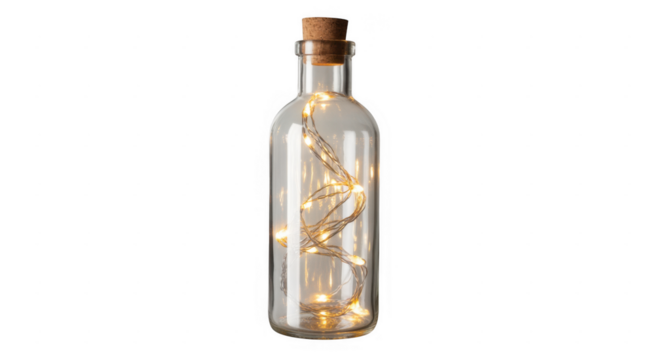 Clear glass bottle with cork stopper filled with glowing warm white L E D string lights isolated on a transparent background
