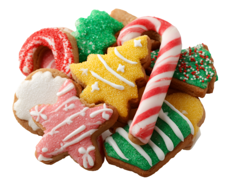 Gingerbread cookies with festive icing including trees and candy canes, classic holiday PNG conveying warmth and tradition