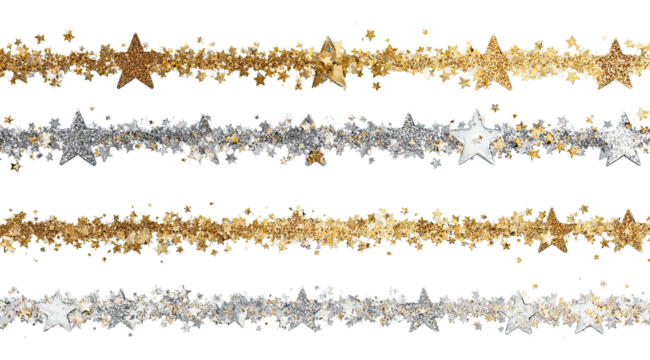Sparkling metallic star garlands on black background. Celebration, holidays, decoration concept