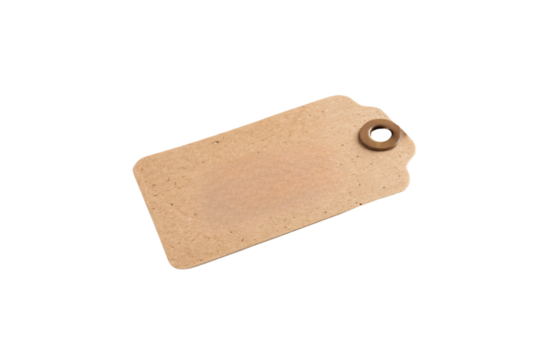 A blank kraft paper tag with a reinforced hole, evoking simplicity, minimalism, and eco-friendly aesthetics for handmade or organic products, isolated on a transparent background