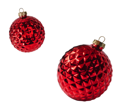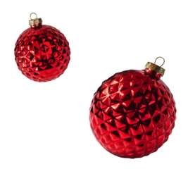 Christmas holliday image, Christmas bauble in shape of a red balls falling in the air isolated on white background