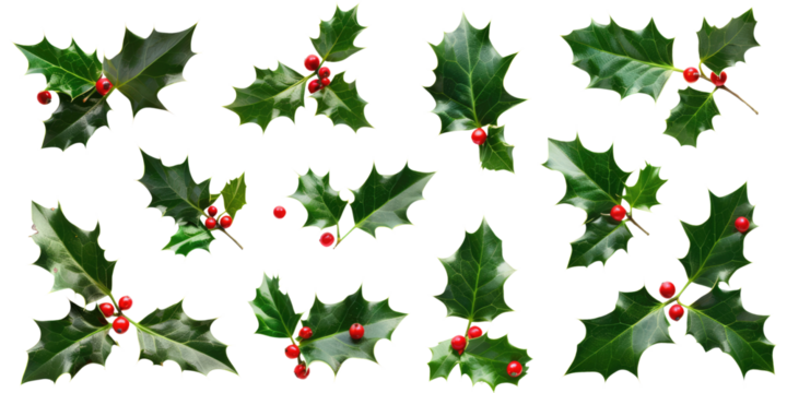 A collection of green holly leaves with red berries for Christmas decoration isolated on white or transparent png