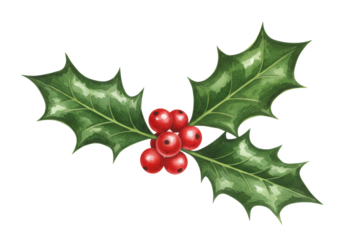 A festive holly sprig with vibrant red berries and deep green leaves