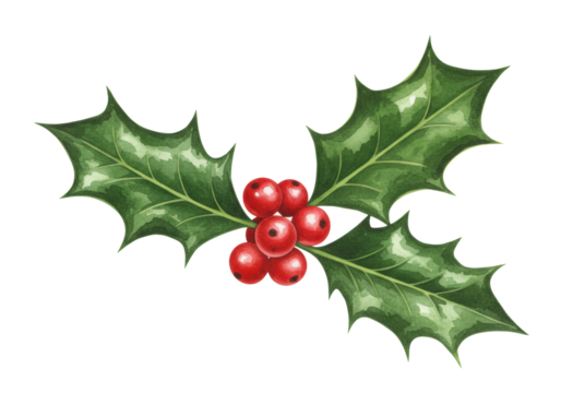 Detailed, glossy depiction of a sprig of holly with red berries