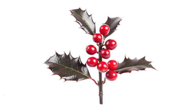A single sprig of lush green holly with bright red berries isolated on transparent background