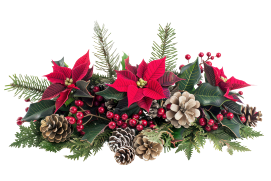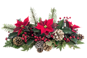 A festive holiday arrangement of poinsettias, holly berries, and pine cones. ,Isolated on white background