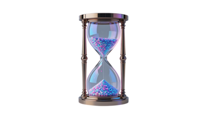 A modern holographic 3D hourglass with glowing sand, isolated on white background, symbolizing time, progress, and futuristic design. Perfect for themes related to time management, digital innovation