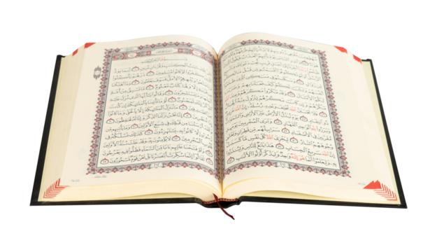 A close up shot of a quran with a red bookmark on a black background with golden embellishments on transparent background