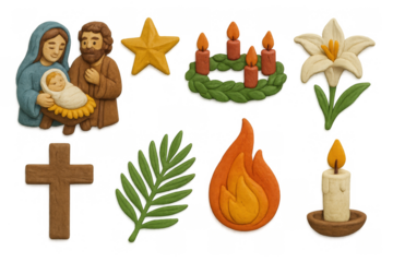 Handcrafted clay icons featuring nativity scene and religious symbols