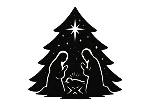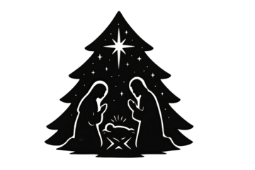 Nativity scene silhouette with holy family under Christmas tree and shining star symbolizing peace love and divine birth isolated on white background