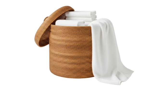 Isolated rattan laundry hamper filled with fresh towels for home hotel or spa storage needs