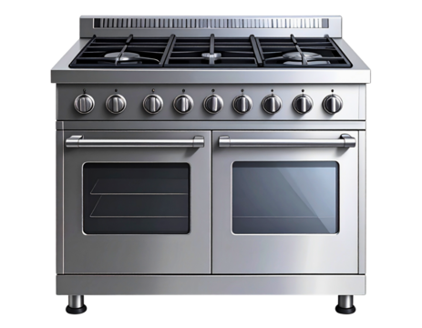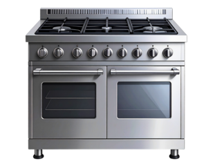 Stainless steel gas range with multiple burners and oven for home kitchens, cooking, and culinary preparations, transparent background