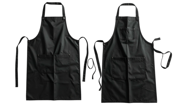 Two frontal views of black aprons with pockets, neck straps, and waist ties