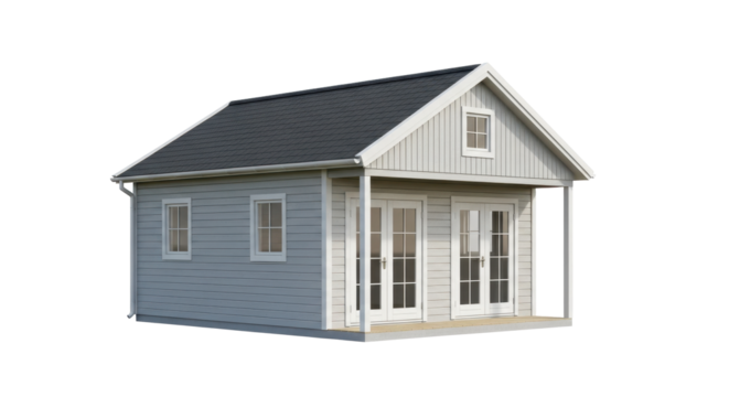 Charming modern tiny house with double doors and windows, perfect for cozy living or backyard office inspiration