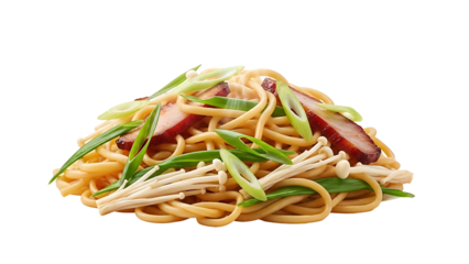 A close-up shot of delicious noodles with green onions and sliced meat. The noodles are expertly presented