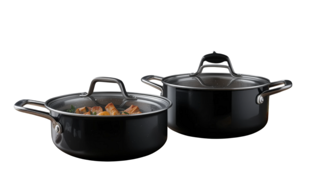 Two black cooking pots with glass lids sit side by side, one filled with cooked vegetables, showcasing modern kitchenware ideal for culinary brands and home chefs.