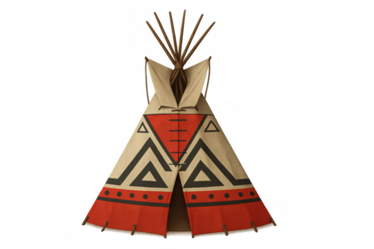 Tipi dwelling with traditional patterns representing indigenous culture and history, standing on transparent background
