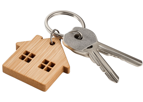 golden key and house keychain symbolize home ownership and security, representing dream of owning home. This evokes feelings of warmth and stability