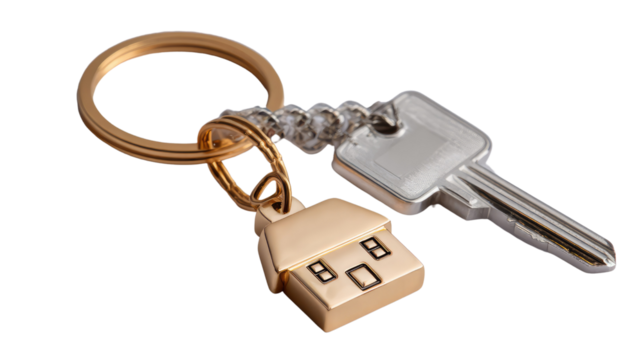 Key to new Beginning: A macro image of a house-shaped charm key chain paired with a silver key, symbolizing ownership, security, and the journey to a new home.
