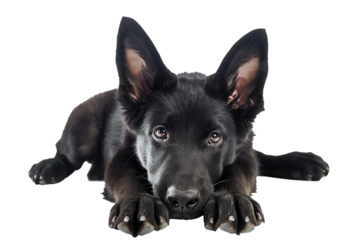 Adopting homeless animals. Isolated cute black puppy laying down on the ground.