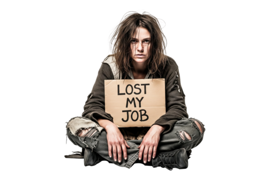 Unemployed and homeless woman holding a cardboard sign that says Lost My Job.