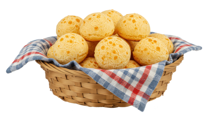 A basket filled with brazilian cheese bread, called pão de queijo, on a checkered cloth