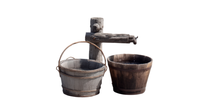 Rustic Water Dispenser: An aged wooden water dispenser, accompanied by matching buckets, offers a glimpse into a simpler past. The rustic scene is a testament to history and manual labor.