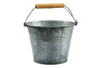 Metallic pail w/ wooden handle. Aged, rustic. Isolated