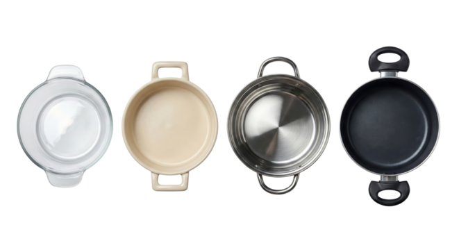 A collection of four assorted cookware items featuring diverse materials and designs isolated on a