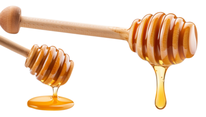 Close-up of wooden honey dippers with golden honey dripping isolated on white background, showcasing natural sweetness and texture.