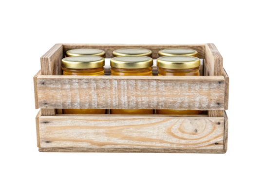 A hexagonal glass jar filled with golden amber honey and sealed with a shiny gold lid isolated on transparent background