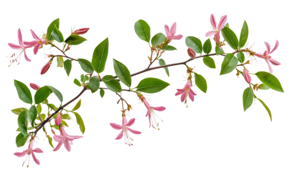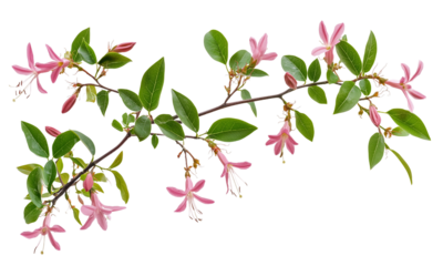 Delicate pink Honeysuckle flowers with lush green leaves isolated on white background and transparent background