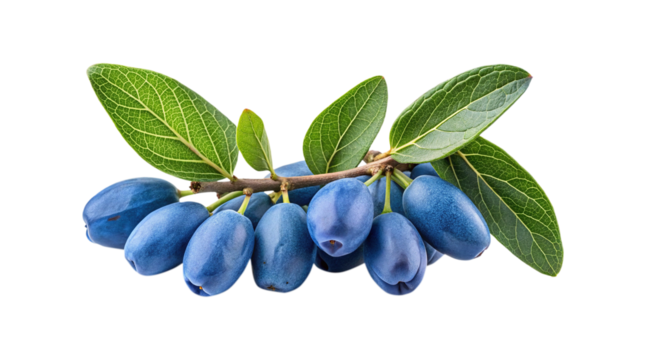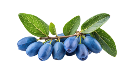 A large cluster of ripe blue honeysuckle berries with green leaves isolated on transparent background