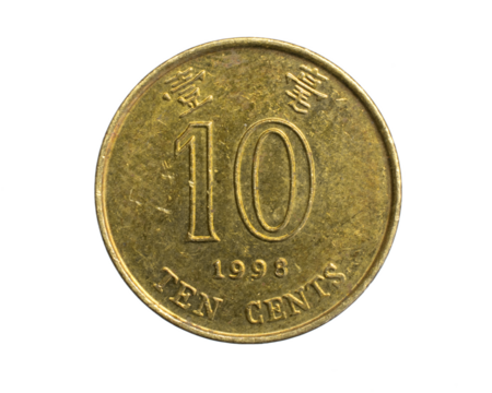A Hong Kong ten cents coin on a white isolated background