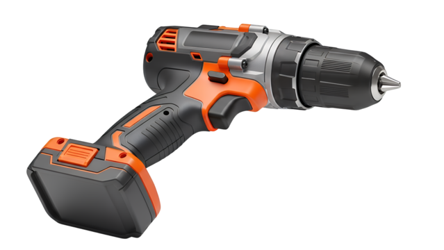 Close-up view of a cordless drill isolated on transparent background, showcasing its ergonomic design and vibrant orange accents.