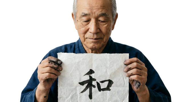 熟練書家が和紙を手にしたクローズアップの静かな表情を捉えたスタジオポートレート|背景なし・透過PNG・コピースペース