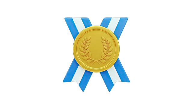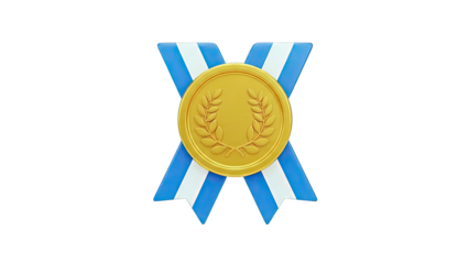 Gold medal with blue and white ribbon