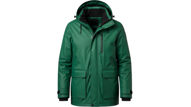 Green waterproof jacket with hood and front pockets in a three quarter view, cutout, PNG isolated on white or transparent background