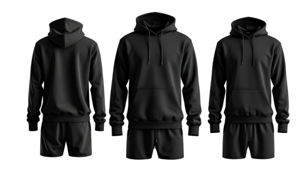 Black hooded sweatshirt front and back view on a black background isolated on a transparent background