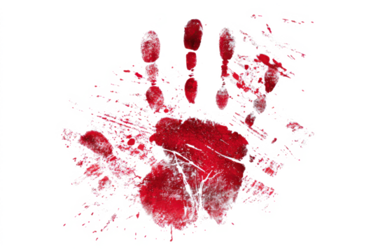 A vivid red handprint with splatters and smudges, resembling blood, starkly contrasts against a clean white background, suggesting a scene of crime or horror.