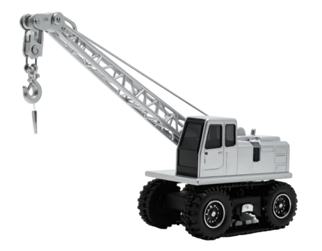 Yellow under construction sign hanging from crane hook isolated on transparent background