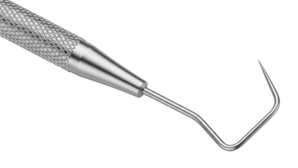 Metal dental explorer tool with textured handle on png isolated transparent background black background