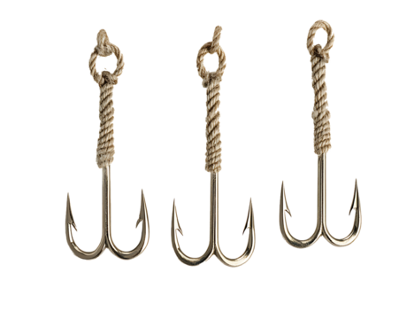 Three sharp fish hooks hanging from rope on white background.PNG.AI GENERATED