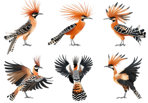 various artistic depictions of a hoopoe bird. highlighting its distinctive orange and black plumage and elaborate crest the birds are presented in different poses. emphasizing their unique features an