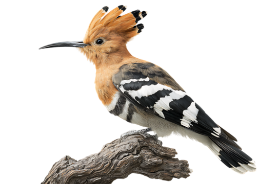 Common hoopoe (Upupa epopts) fascinated brown crested bird with white and black wings isolated on transparent Bg