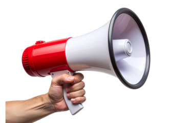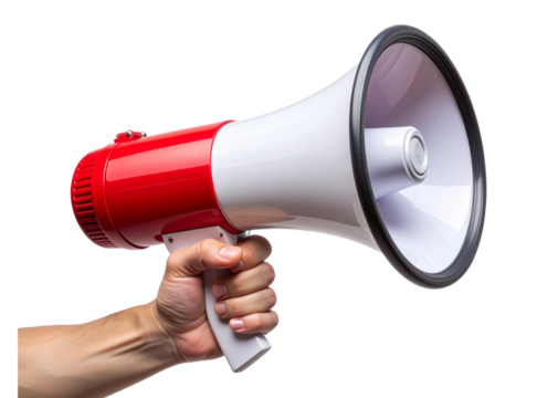 Human Hand Gripping Red and White Megaphone – Isolated Clipart PNG