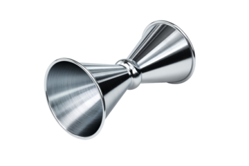 A silver metal measuring cup with a curved top